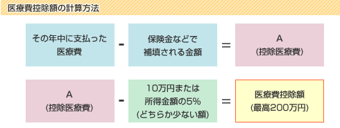 医療費総額から補填保険金を引き、そこから「10万円」か「所得の5%」のいずれか少ない金額をさらに差し引いたものが控除対象の金額となります。